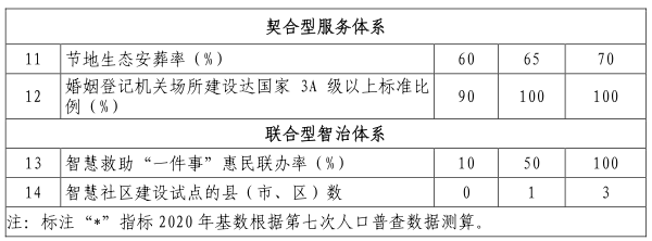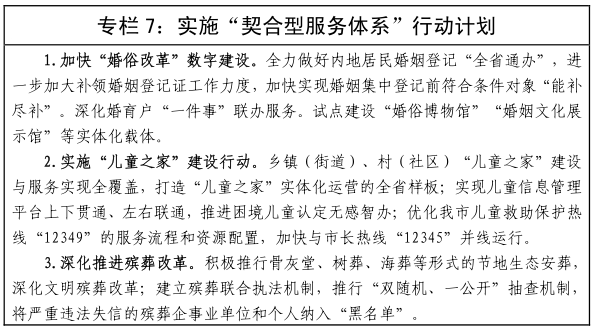(五)優化惠民暖心的契合型服務體系 圍繞惠民暖心服務的目標,全面提升基本社會事務貼心化、標準化建設,切實增強基本社會事務服務能力,強化民政基本社會服務品牌建設,打造以人民對美好生活服務需求為導向的“契合型服務體系”。 18.提升區劃地名管理法治化科學化水平。圍繞“二次城市化”,積極穩妥優化行政區劃設置。完成第四輪并啟動實施第五輪行政區域界線聯檢工作。深入推進平安邊界建設,提升行政區 域界線管理水平。加強地名標準化管理,持續清理整治不規范地名。建立健全地名地址管理服務系統,推進地名數據開發應用,完成地名系統政府數字化轉型項目,積極開展數字門牌建設試點,全力提升地名公共服務能力。強化地名公共服務與地名文化服務經濟發展能力建設,組織開展地名文化遺產申報、認定和保護工作,加大地名文化遺產保護力度。推進地名文化遺產保護和成果轉化,探索地名文化服務助力鄉村旅游、鄉村振興的能力提升。對接基層治理平臺,建立完善以地名規范、地名規劃、地名設標和數字地名為主要內容的地名公共服務體系,積極開展地名文化服務與文化建設試點。 19.提升婚姻登記服務水平。宣傳貫徹執行《中華人民共和國民法典》婚姻家庭編,推進婚姻登記機關規范化和標準化建設,全市婚姻登記機關場地建設全部達到國家 3A 級標準。推廣“互聯網+婚姻服務”,繼續加強婚姻登記信息化建設,優化婚姻電子證照共享應用,實現婚姻登記精細化、智慧化、智能化。率先推進跨區域婚姻登記工作,推進結婚生育戶口“一件事”聯辦,探索婚姻登記實行全國通辦。繼續推進婚姻家庭輔導和結婚登記免費頒證服務,進一步拓展婚姻登記服務的內涵,重點文化禮堂、婚姻文化基地等頒證場所,開展重要時間節點領導、社會知名人士頒證日活動等內容,扎實推進婚俗改革,加強婚姻文化建設。 以提升婚登服務為出發點,不斷深化婚登人員隊伍規范化建設,積極構建婚姻家庭輔導長效機制,將專業社會工作方法融入到婚姻登記的服務全過程中,凝聚起社會組織支撐、社工和志愿者共同參與的婚姻家庭輔導服務工作合力。 20.完善兒童福利關愛體系。推動建立臺州市未成年人保護工作委員會,深化兒童福利體系建設,完善形成政府主導、民政牽頭、部門協同、社會參與的關愛保護工作機制。建立市、縣、鄉、村四級聯動的工作機制,構筑覆蓋城鄉的基層兒童福利服務和保護體系。市、縣級層面建立未成年人保護工作委員會,建立部門聯動關愛機制。整合縣(市、區)兒童福利服務資源,持續實施“明天計劃”項目,進一步推動“添翼計劃”的擴面提檔工作,切實提高孤殘兒童和困境兒童服務保障水準。縣(市、區)未成年人救助保護中心實體運行,面向農村留守兒童和困境兒童做好指導、摸排、探訪、幫扶等工作,開展農村留守兒童、困境兒童服務和未成年人保護工作。鄉鎮、村居層面要堅持選優配強,確保有能力、有愛心、有責任心的人員從事兒童關愛保護服務工作。加強基層兒童福利服務設施建設,推進兒童福利機構優化提質和轉型發展,向集養育、康復、教育、醫療、社會工作一體化發展的區域性兒童福利機構邁進,探索孤殘兒童和符合條件的困境兒童集中供養模式。依托村(社區)服務中心、文化禮堂、學校等設施,統籌推進“兒童之家”建設,到 2025 年,全市范圍內建成“兒童之家”500 家,解決關愛保護工作“最后一公里”的問題。 21.深化綠色惠民殯葬改革。繼續推進殯葬綜合改革,切實提高殯葬領域治理水平,強化殯葬服務事業單位的公益屬性。推進以骨灰堂、樹葬為切入點的節地生態安葬,建立 30 個節地生態安葬示范點,到 2022 年,鄉鎮(街道)建有節地生態安葬點,行政村覆蓋率達 100%。建立健全基本殯葬公共服務體系,加強殯葬基礎設施規劃和建設,推行集中守靈,推進喪事服務規范化管理。大力推行文明節儉生態殯葬,深入開展殯葬改革宣傳活動,強化正向引導,充分發揮黨員干部、鄉賢等模范帶頭作用。強化群眾自我管理,把移風易俗納入村規民約和居民公約,引導群眾破除喪葬陋習。打造“互聯網+殯葬服務”,建立和完善殯葬服務智慧平臺建設,全面推行“現場祭掃預約、網上綠色祭掃”,讓“數字文明祭掃”成為新常態。