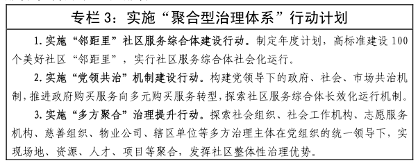 三、主要任務 (一)創新黨建統領的聚合型治理體系圍繞共建人民幸福美好家園,通過完善黨組織領導下的城鄉社區治理制度,實施社會組織能力提升工程,推動社會工作加快發展,暢通社會組織、社會工作、志愿服務參與基層治理渠道,形成以“鄰距里”社區服務綜合體為載體、創新多方協同機制,打造城鄉社區治理共同體。 1.全面落實黨領導下的城鄉社區治理機制。合力推進黨建統領的社區治理格局,推動形成“社區大黨委+小區黨組織+社會組織+居民自治”的治理體系。進一步夯實村(居)民自治基礎, 加快推行社區自治清單、服務清單和共建單位服務清單,吸納社會力量參與社區治理。完善基層民主協商制度,探索制定民主協商臺州標準。積極運用“民主懇談”“鄉賢議事”“紅色物業”等載體,發揮好村規民約、社區公約、自治章程的作用,促進法治、德治、自治有機融合。全面構建黨領導下的社區、物業、業委會“三方協同”小區治理機制,擴大黨的組織覆蓋和工作覆蓋,提升社區物業管理水平。加強村級組織換屆后村級組織權力運行監管機制,完善黨領導下的群眾自治制度,推進基層民主制度化、規范化。建立完善村(居)民委員會成員履職承諾制度,全面建立村民代表履職規范化制度,探索開展“村民代表履職省級標準” 制定工作。加快培育城鄉社區社會組織和志愿者隊伍,探索社區治理中的社會工作介入機制,深入推進精密智控在社區應急管理中的應用。探索智慧社區建設試點工作,大力推進省級和市級社區治理和服務創新實驗區建設,以體制機制創新助推全域基層治理創新,爭取申報國家級實驗區。 2.夯實城鄉社區服務體系建設。探索全面推進“鄰距里”社區服務綜合體建設,建立綜合體建設標準,以新建、改造、購買、置換、項目配套和整合共享等形式,提供集公共服務、 志愿互助服務及醫療衛生、養老與兒童青少年服務、鄰里交往、居民議事等于一身的“一站式”綜合體服務。積極引入社會力量承接社區服務綜合體運營,建立以項目為導向的政府購買服務機制,全面提高社區服務供給能力。鼓勵有條件的鎮街與社區探索臺州特色“居民會客廳”的空間設置與運行機制,強化小區服務和鄰里服務。全面開展新村融合發展,加大城鄉社區一體化發展步伐,強化社區布局規劃與未來社區、文化體育等規劃銜接,努力探索面向未來的社區治理、服務、鄰里等多場景建設。創新社區服務積分制,激活居民參與的內在動力,探索以社區營造、微更新等方式促進社區有機更新。探索社區基金會運作機制,鼓勵和引導各類市場主體參與社區服務。積極參與未來社區建設,加強未來社區的社區工作者力量配備和隊伍能力提升建設,提升未來社區治理能力,助推市域治理現代化。進一步明確村(社區)職責任務,完善配套制度,落實村(社區)減負工作。落實“三崗十八級”薪酬體系,聚焦職業化、專業化、本土化目標,不斷健全社區工作者選拔聘用、管理考核、教育培訓、激勵保障體系。注重從連續任社區主職滿 5年、表現優秀的社區黨組織書記中招錄(招聘)鄉鎮(街道)公務員、事業編制人員。強化社區工作者隊伍建設,培養一支政治堅定、作風過硬、結構合理、數量充足、業務精通、群眾滿意的專職社區工作者隊伍。 3.發揮社會組織參與基層治理的重要作用。進一步完善社會組織黨建工作機制,持續推進社會組織黨群服務中心建設。激發社會組織活力,加大城鄉社區服務類社會組織培育發展,持續推動政府購買服務和公益創投。深化社會組織數字化改革,實現社會組織登記、年檢、備案、專項管理等事項“網上辦、碼上辦、掌上辦”。加快培育品牌社會組織和社會組織領軍人才,持續實施社會組織品牌三年提升計劃。鼓勵公益性社會組織積極參與基層治理,出臺公益性社會組織扶持規范發展的意見。打造社區社會組織參與基層治理臺州品牌,著重在基層社會治理、為老服務、社會救助、扶殘助殘等基本民生服務領域打造一批可復制、可推 廣、有影響力的社區社會組織參與基層治理品牌。積極推進社會組織參與鄉村振興,培育和發展農村社區社會組織新業態,提升社會組織助力鄉村振興能力。 4. 深化社會工作專業人才隊伍建設。提升隊伍綜合素質,按照不同人才類型實施分類培養,到 2025 年,全市持證社會工作專業人才總量達到 1.5 萬人,培育 50 名社會工作督導人才。加快構建社會工作專業人才培育體系,以臺州社會工作名家工作室為載體,推動各縣(市、區)與高校等科研院所合作建立實訓基地。加快推進鄉鎮(街道)社會工作站全覆蓋,積極探索社工站運行模式,延伸基層民政工作臂力。支持推進落實民政事業單位原則上以社會工作專業技術為主體專業技術崗位,支持民政事業單位、城鄉社區和社會服務機構設置社會工作崗位,配備社會工作專業人才,推動社會工作者職業資格與專業技術職務評聘相銜接。探索農村發展型社會工作,推進社會工作參與鄉村振興。拓展社會工作服務領域,推動醫務、教育、企業等領域加快開展社會工作服務。健全政府購買社會工作服務長效機制,推進“社會工作+志愿服務”協作機制,引導慈善資金購買或支持社會工作服務機構開展公益服務。