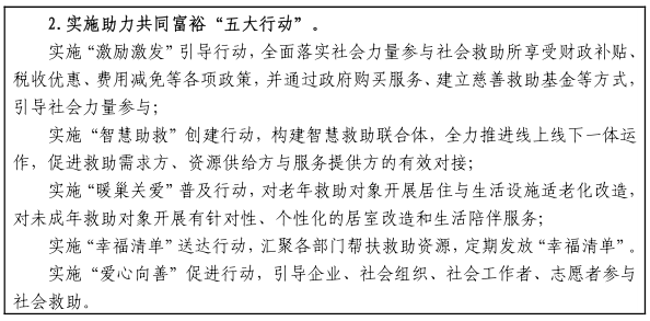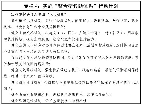 (二)構筑精準保障的整合型救助體系 圍繞精準兜底與整合發展的要求,促進各項社會救助制度銜接,激發社會力量有效參與,提升多部門、多主體、多機制整合救助能力,建立健全解決相對貧困兜底保障長效機制,有效形成制度銜接、部門合力、社會參與、智慧高效的“整合型救助體系”。 5.加強社會救助的制度銜接。建立健全“1+8+X”的新時代大救助體系,加快完善以基本生活救助、專項社會救助、急難社會救助為主體,社會力量參與為補充的分層分類救助制度之間的銜接,重點在醫療、教育、住房、就業、災害等方面形成更加完善的監測預警、主動發現和自動匹配政策的精準救助協同機制。打造多層次分類的梯度救助機制,科學劃分社會救助圈,拓展社會救助類型和對象,擴大社會救助覆蓋面。強化救助項目統籌,對資金投入方向、管理方式相近的社會救助項目進行整合。加強和改進臨時救助工作,科學制定分類分檔臨時救助標準。完善生活無著流浪乞討人員救助管理體系,貫徹落實中央和省兩級關于加強和改進生活無著的流浪乞討人員救助管理工作的意見。 6.強化多方救助力量的整合。完善大救助平臺建設,構建智慧救助聯合體,促進救助需求方、資金供給方與服務提供方三方有效對接,推進慈善組織、社會組織和愛心企業、志愿服務力量參與社會救助。拓展精準救助服務內容和形式,健全困難群眾救助幫扶機制,協助社會救助申請及動態管理。通過政府購買服務、建立慈善救助基金等方式,設立社會救助服務項目,積極引導社會組織、專業社工、志愿者隊伍開展家境調查、人文關懷、心理疏導、資源鏈接、能力提升、社會融入等救助服務,激勵多維社會力量參與社會救助。引導社會資本參與社會救助,鼓勵保險公司開發對群眾生活困難提供保障的險種,推動社會救助“關口前移”。發揮向善力量,積極培育和發展參與社會救助的社會企業,充分發揮其在社會救助中的積極作用。鏈接慈善、福彩資源,探索困難家庭救助幫扶綜合評估,積極發展服務類社會救助。全面建立救助對象探訪關愛制度,積極引導黨員干部結對幫扶社會救助家庭,實現社會救助家庭結對全覆蓋。 7.統籌提升社會救助水平。全市低保、特困人員基本生活標準每年根據經濟社會發展水平適時調整。開展脫貧攻堅兜底“回頭看”,完善“兩線合一”機制,助力鄉村振興。繼續開展支出型貧困救助,完善鄉鎮(街道)臨時救助備用金制度,進一步規范先行救助程序和標準、類型和對象,擴大社會救助覆蓋面。建立健全解決相對貧困的兜底保障長效機制,加快推動社會救助從收入型單維救助向綜合指標型多維救助、從按戶籍人口救助向按常住人口救助、從物質類救助向“物質+服務”類救助、從分散型救助向聯合型救助轉變。 8.打造“智慧救助”示范區。深化救助領域“最多跑一次”改革,大力推行“互聯網+救助”,構建市、縣、鄉、村四級聯動機制,各類社會救助業務全覆蓋的信息系統全面完善。優化“申 請、審核、認定、救助、管控”的工作流程,完善社會救助事項網上“惠民聯辦”工作機制,實現各類社會救助數據在線查詢、救助業務在線審批、救助對象在線管理。加快救助信息互聯互通、開放共享和救助服務“碼上辦”,逐步實現救助事項“一鍵核對、一證(居民身份證)通辦”,推動救助服務向移動端延伸。強化救助信息共建共享,加強社會救助信息共享,實現“幸福清單”查看、入戶調查、探訪關愛、結對幫扶等“幸福碼”應用。積極探索應用“幸福碼”實施社會力量參與社會救助,實現服務需求發布、篩選、認領以及服務輸出和評價反饋功能,實現積極主動、精準高效的救助服務。開展社會救助市域范圍內異地申請服務, 探索將最低生活保障等救助審批權限下放至鄉鎮(街道),縣(市、區)民政部門強化備案管理和事后監管。