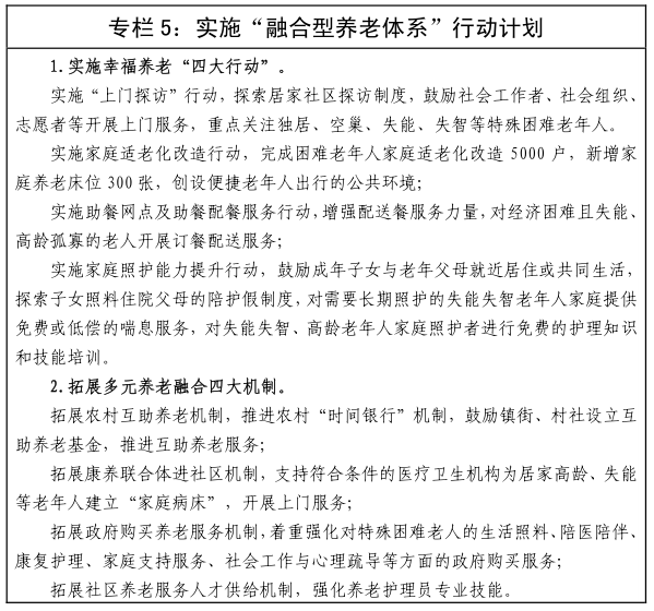 (三)深化幸福頤養的融合型養老體系 圍繞“幸福養老”建設目標,著眼與居家社區機構相協調,與醫養康養相融合的養老服務體系,聚焦基本養老服務,聚焦失能失智,聚焦養老服務人才隊伍,尊重老年人自主權利,激發家庭養老服務功能,弘揚積極老齡化觀念,打造臺州特色的全主體參與、全要素融合、全周期服務的“融合型養老體系”。 9.深化發展普惠型養老。持續推進公辦養老機構改革,對公辦養老機構實行建設成本標準指導和收費價格指導。充分發揮公辦養老機構的引領作用,堅持公辦養老機構(含公建民營)的公益屬性,重點為經濟困難失能老年人、計劃生育特殊家庭老年人提供無償或低償托養服務。以護理型床位建設為主,突出養老機構的生活照料、康復護理及助醫服務功能,到 2025 年,養老機構護理型床位占比達到 58%。對民辦非企業單位登記養老機構加強財務審計和年度審查,確保公益性,鼓勵民辦養老機構提供普惠養老服務。建立優化兼顧老年人身體狀況與家庭經濟狀況的失能失智老年人長期照護保障制度。實現鄉鎮(街道)居家養老服務中心專業化、常態化服務全覆蓋,充分發揮六大功能,大力發展助餐、助浴、助急、助醫、助行、助潔等服務。完善城鄉社區居家養老服務照料中心及老年食堂的長效運行機制。持續推進敬老院改造計劃,推進城鄉養老服務均衡發展,加強城郊地區、山區等地老年人的基本養老服務保障。 10.推進社區養老多元融合。實現居家養老服務設施全覆蓋,深化以“文體娛樂、康復理療、智慧養老、輔具租賃”等多種功能的老年活動中心建設,使之成為老年人開展各類活動的重要場所。持續創新“家院互融”社區養老模式,鼓勵支持養老機構運營社區養老服務設施,設立服務場所,為居家老年人提供專業的上門服務,探索打造嵌入式“小微機構”,推動居家、社區、機構養老融合發展。打造“家門口的養老服務”新模式,推進家庭適老化改造和家庭養老床位試點,發展“物業服務+居家養老”、農村互助養老服務,為老年人提供全生命周期的養老服務。 11.加快“醫護康養”融合發展。推進康養聯合體建設,整合養老、醫療和康復資源,以鎮街級居家養老服務中心全覆蓋為基礎,優化建設鎮街、縣域康養聯合體,聯合基層醫療機構、康復機構,探索建立政府、社會、個人合理分擔的康養服務保障機制,為老年人提供個性化、專業化的康養服務。培育和引進康養服務企業,發揮臺州本地醫養集團的領頭和示范效應,進一步培養具有成長潛力的康養服務企業,通過政策吸引更多知名品牌和養老企業落地臺州。建立和完善包括健康教育、預防保健、疾病診治、康復護理、長期照護、安寧療護等在內的綜合連續老年健康服務,形成全周期的融合型康養服務體系。 12.深化養老護理人才隊伍建設。積極打造專業化為主導、社會化為補充的養老服務專業人才隊伍。整合護理員各項獎勵政策,有效提升養老服務人員的經濟和社會地位。提升機構養老護理員專業化能力,高級護理員、技師級護理員占持證護理員 18%以上,不斷提高養老護理員的社會工作持證率。強化社會化養老護理員隊伍建設,協同人社部門放開第三方職業技能等級認定,允許公辦養老機構、民辦非企業單位等多種主體申請認定資質,探索“互助型”社會化養老護理員隊伍建設。結合職業技能水平制定相應的薪酬體系,推動出臺養老護理員崗位津貼政策,有效提升護理員待遇。 13.拓展“智慧養老”服務。充分發揮市級“智慧養老”服務和監管平臺的作用,探索迭代升級的“互聯網+養老”模式。深化對接“浙里養”智慧服務平臺,實現信息共享、供需對接和嚴格監管,為各級各類用戶提供便捷的養老政務服務、公共服務、公益服務和鏈接市場服務。率先出臺智慧養老院建設與運行標準,以數字技術賦能養老為導向,率先探索打造智慧養老院。持續推動智慧健康養老產業發展,進一步提升全市物聯智能養老服務水平,打造數字賦能養老臺州模式。 14.加快養老事業產業融合發展。全面放開養老服務市場,鼓勵民間資本積極參與,打造公平競爭、高效透明的養老產業營商環境。探索建設康復輔具租售平臺,培育養老產品制造新業態,促進養老服務業與其他產業的融合發展,壯大品牌養老企業,實施集團化、連鎖化經營。發揮“制造之都”優勢,探索“養老產品制造產業”建設,積極打造養老產品信息咨詢、信息發布及養老行業服務管理平臺,形成養老產品制造服務大數據。探索建立長三角養老行業綜合監管機制,健全跨部門、跨地區協同監管機制,建立養老誠信系統和失信登記制度。