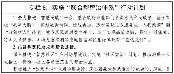 (六)推進便捷高效的聯合型智治體系 全面貫徹數字化改革理念,以“整體智治、唯實惟先”為導向,運用數字化技術、數字化思維、數字化認知對民政工作的體制機制、組織架構、方式流程、手段工具進行全方位系統化重塑,打造“增效能、促參與、優服務、善治理”的“聯合型智治體系”。 22.打造高效協同的“數字民政”新格局。發揮民政數據資源多元化、多樣性、規模大、群眾使用多的優勢,通過數據加工、歸納、演繹和分析,促進數據關聯應用,充分挖掘數據價值,用數據來深入研究民政業務,激發民政數據作為生產和服務要素對經濟社會發展和社會治理的促進作用,為建設數字政府、數字社會、數字臺州,打造浙江“重要窗口”貢獻民政力量。聚焦民政業務條線、上下層級數據互聯互通與集成應用,緊盯民政全業務領域,建立民政數據“整合-開發-使用-成效”一體化機制,逐步實現民政主責主業全面數字化、完全網絡化和高效智能化。落實民政工作數字化協同管理辦法,建立完善民政數據體系,統籌數據需求,明確數據主體、數據權限、數據標準,加快推進數據分類、分級、共享、開放,加大數據脫敏力度,建立數據全生命周期管理機制。加強數據安全監測預警和態勢感知能力建設,保證民政數字系統穩定安全運行。 23.創新數字賦能的“智治民政”新機制。全力深化智慧民政“減負增服務促參與”機制,以民政領域數字化改革為契機,迭代升級臺州市民政共享交換平臺,落實民政 12 個條線的“碼上辦”服務,以數字賦能構建“數據采集+需求分析+決策實施+評估修正”的民政工作閉環體系,對民政服務治理對象精準畫像、動態預警、主動服務,縱向暢通到底。堅持能共享則共享、能開放就開放的原則,全面推進民政數據共享交換和開放應用。不斷拓展數字化改革的廣度和深度,形成自下而上的民政應用場景創新。著力推進“一件事”改革,實現困難群眾社會救助、特殊群體救助、公用事業民生補貼等 14 項民生補貼事項“一件事”一 站式線上集成辦理。 24.推進城鄉融合的“智慧治理”新模式。圍繞社區群眾需求和治理服務場景應用導向,全力推進“政府管用、社區有用、居民愛用”的基層數字治理平臺,打造“全要素精密智控、全周期精準服務、全流程閉環管理、全維度治理場景、全內容數字生態、全業務融合平臺”等“六全”為核心的社區智治體系。全面推進縣(市、區)智慧社區建設工作,注重平臺整合,打破信息孤島,深化數據共享,強化線上線下一體化服務能力,推動數字化改革向社區延伸,打通服務群眾的“最后一公里”。深化智慧治理實踐,加快互聯網與社區治理和服務體系的深度融合,運用社區論壇、微博、微信、移動客戶端等新媒體,引導社區居民密 切日常交往、參與公共事務、開展協商活動、組織鄰里互助,探索網絡化社區治理和服務新模式。 25. 創建精準高效的“數字評價”新標準。以提升民政工作數字化率、民政資源數字化率和民政服務智能化率為抓手,研究推出民政數字化指數評估衡量機制,建立數字化改革指標體系。設定算法智能提取數據,自動計算市、縣(市、區)二級民政數字化指數,定期發布并納入考評指標。到 2025 年,民政工作數字化率達到 90%,并逐年提升民政領域資源數字化率和民政服務治理智能化率,做到“一個指數量全市”。