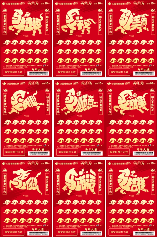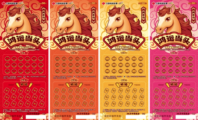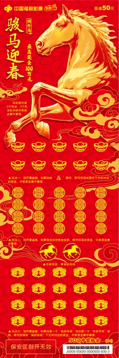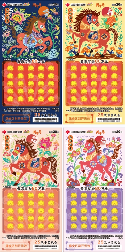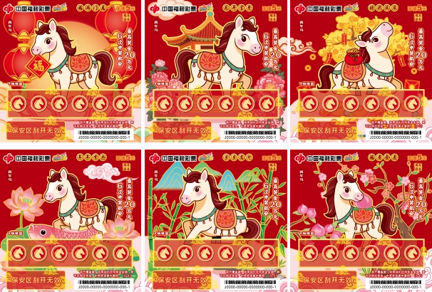 “駿馬迎春”系列,單款成輯,獨具一格。票面主體為一匹鎏金駿馬,昂首騰躍,姿態昂揚,肌理流暢,在紅金配色的映襯下愈顯華貴大氣,完美詮釋了“馬到成功,金玉滿堂”的傳統吉兆。玩法區的覆蓋膜也暗藏巧思,元寶、回紋福字、如意云紋三種浮雕紋樣精巧點綴,分別寓意招財、納福與萬事如意。方寸之間趣味橫生,在古典寓意與現代審美間取得精妙平衡,盡顯設計巧思與厚重底蘊。 依干支紀年法,天干為“丙”、地支為“午”,是為丙午馬年。馬在中華傳統文化中的地位尊崇,自古以來,馬一直被視為力量、順遂與福運的吉祥象征:馬是國之重器的體現,“馬者,甲兵之本,國之大用”,冷兵器時代,馬匹數量是衡量國力的重要指標,亦是等級秩序的直觀體現。馬是精神圖騰的傳承,伏羲據“龍馬負圖”創八卦,啟華夏文明,馬是“驥不稱其力,稱其德也”的忠誠與堅韌,也是“人生天地之間,若白駒之過隙,忽然而已”的自由與奔放。馬是民族精神的聯結,是“銀鞍照白馬,颯沓如流星”般昂揚進取的奮斗精神,亦是“乘騏驥以馳騁兮,來吾道夫先路”的忠誠擔當和家國情懷,更是“萬馬奔騰”般萬眾一心、眾志成城的集體力量。 福彩刮刮樂“丙午馬”生肖票,承載著傳統生肖文化的鮮活記憶,寄托著福彩“送福添彩”的美好初心。愿這份新春福氣,隨著一張張福利彩票溫暖傳遞,讓更多團圓時刻,添一份幸運,多一份喜樂。愿每個人都能拿出躍馬揚鞭的勇氣,激發萬馬奔騰的活力,保持馬不停蹄的干勁,一起為夢想奮斗、為幸福打拼,把宏偉愿景變成美好現實。