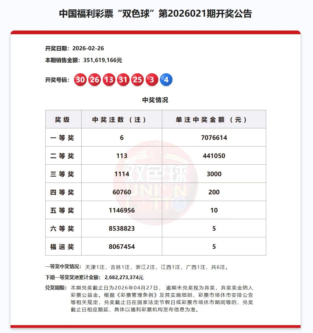 2月26日, 福彩雙色球第2026021期開獎, 一等獎獎金成色不減, 二等獎獎金顯著提升, “福運獎”普惠多多, 讓廣大購彩者在奉獻愛心的同時, 獲得了更多更好的中獎體驗。
