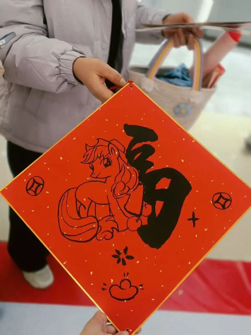 現(xiàn)場(chǎng)大家隨機(jī)抽取盲盒卡片,書法家即興揮毫,盡顯筆力,讓每個(gè)人都領(lǐng)到心儀的春聯(lián)。“這是我網(wǎng)上看到很喜歡的‘福’,臺(tái)州市漫畫家協(xié)會(huì)的老師們現(xiàn)場(chǎng)把它一比一復(fù)刻出來(lái)了,太厲害啦!”市民潘女士開心地展示道。