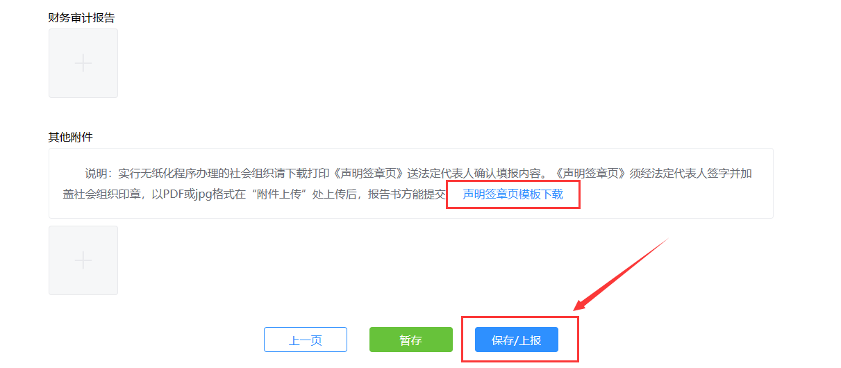 ? 5.完成網頁內容填報,經民辦非企業單位負責人審閱后,在“上傳附件”頁面下載《聲明簽章頁》,由法定代表人簽字承諾、加蓋民辦非企業單位印章后,以圖片格式在附件中上傳。以上操作完成后,點擊“保存/上報”按鈕提交。
