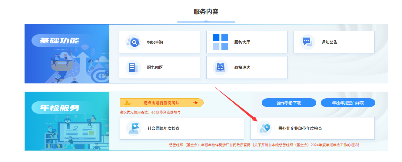 ? 2.進入“浙里社會組織”后點擊“請點擊進行身份確認”,根據彈出頁面進行“法人用戶登錄”操作,或者點擊“民辦非企業單位年度檢查”進行“法人用戶登錄”操作。