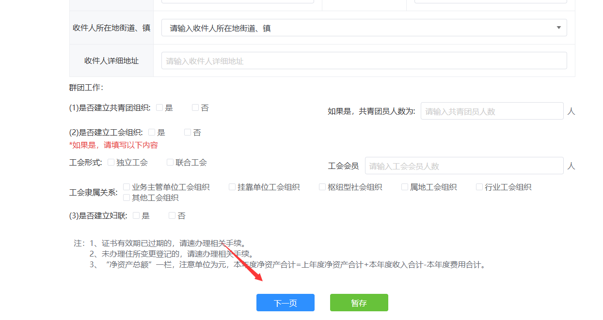 ? 4.填寫表單內容需注意: (1)點擊“下一頁”按鈕,系統自動保存本頁填寫內容。 (2)各種原因需要臨時保存的,請點擊“暫存”按鈕。