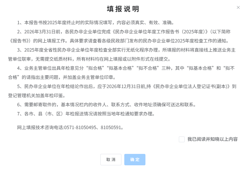 ? 3.登錄后,請點擊“年檢填報”,進入填報頁面。 點擊后需要閱讀填報說明(10秒倒計時),倒計時結束后點擊“已閱讀-確認”進入填報頁面。
